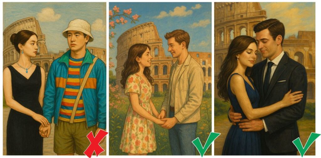 Coordinating doesn’t mean wearing the exact same colors or looking identical. Sure, thinking about a color palette (as I write in another article) is always useful, but the real point is to stay close in style. If one person chooses a very elegant look and the other goes for something too sporty, the result in the photos can feel a bit off. Instead, it’s enough to find a common thread — whether it’s a mood, a fabric, or just a similar level of formality. This way each outfit keeps its individuality, but together the photos look harmonious and timeless.