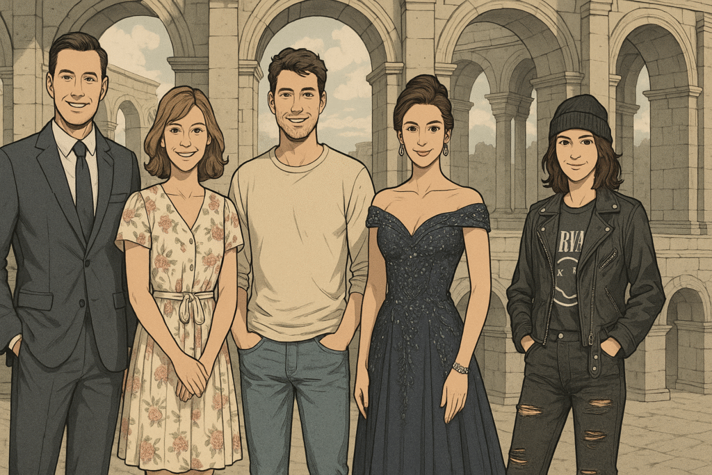 How can you make safer choices? Look at photos you like from the past: notice how certain looks always work, never go out of style. A well-cut blazer, a long dress that drapes beautifully, clean jeans with a simple shirt, or a minimal but polished sporty outfit… all examples that last. And yes, you can add a personal touch, like a lightweight scarf, a stylish hat, or an accessory that represents you—just don’t overdo it. The idea is to create a look that speaks about you, without stealing attention from the memory you want to capture.